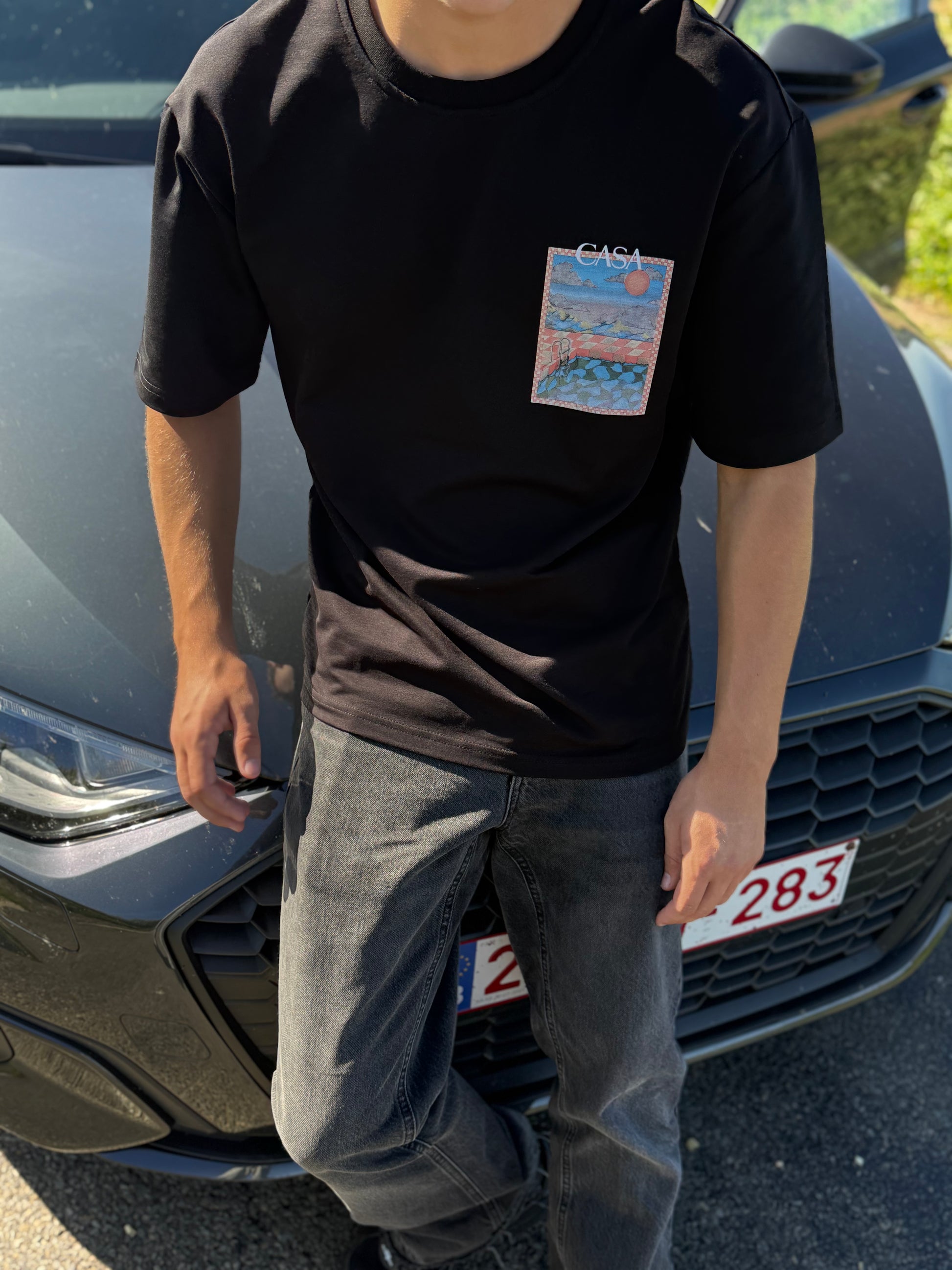 - Dos : grand imprimé coloré représentant une vue méditerranéenne avec mer, soleil et palmiers.